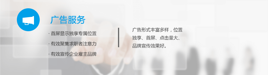 廣告服務(wù)基于龐大的網(wǎng)絡(luò)平臺(tái),位于首屏,企業(yè)客戶可以在首頁擁有專享位置,被推薦的職位和公司始終占據(jù)求職者的第一視線,極大地聚焦求職者的注意力,從而大幅度提升招聘職位的關(guān)注度、點(diǎn)擊量及招聘效果。廣告有知名企業(yè)招聘、熱點(diǎn)招聘、品牌招聘、搜索置頂、海報(bào)等多種類型。企業(yè)客戶可根據(jù)招聘需求選擇合適的廣告類型,完成招聘需求。