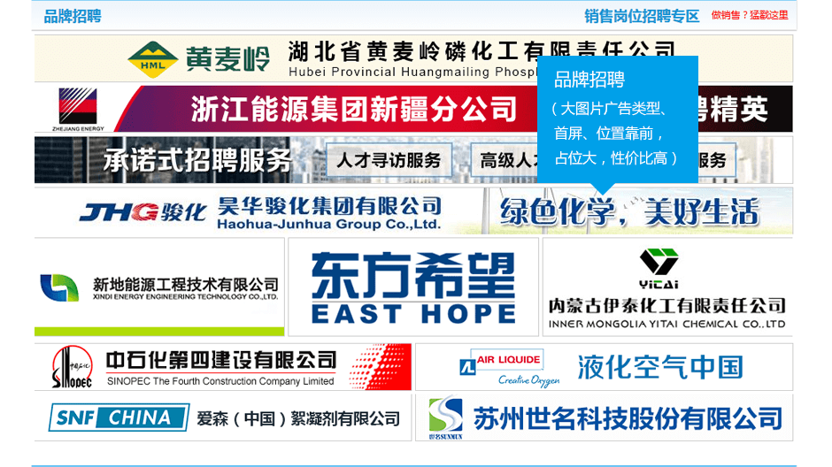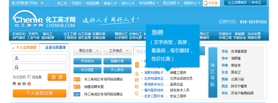 急聘急聘區(qū)位于首屏導(dǎo)航下方位置顯著,極大吸引求職者注意力及對(duì)招聘位置的關(guān)注度,有效解決企業(yè)緊急招聘問題。