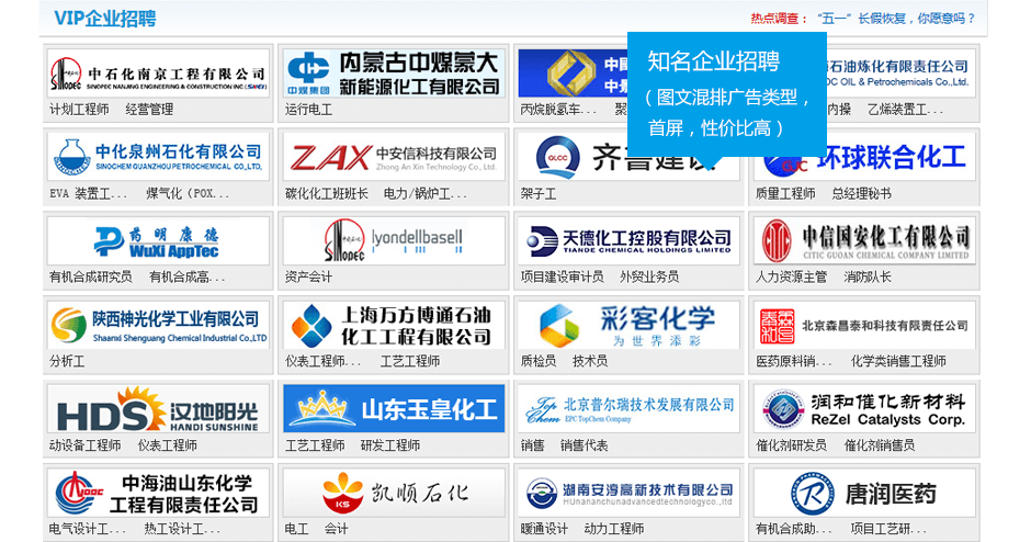 對(duì)聯(lián)廣告對(duì)聯(lián),位于首屏兩側(cè),隨屏幕而動(dòng),有效吸引求職者注意力和對(duì)招聘職位的關(guān)注度。